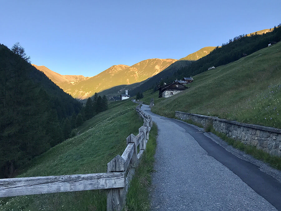 Dalla deviazione inizia una larga carrozzabile che sale costantemente fino al rifugio Cassana (Attualmente chiuso) e poi si prosegue su largo sentiero fino al Passo Cassana al confine tra Italia e Svizzera.